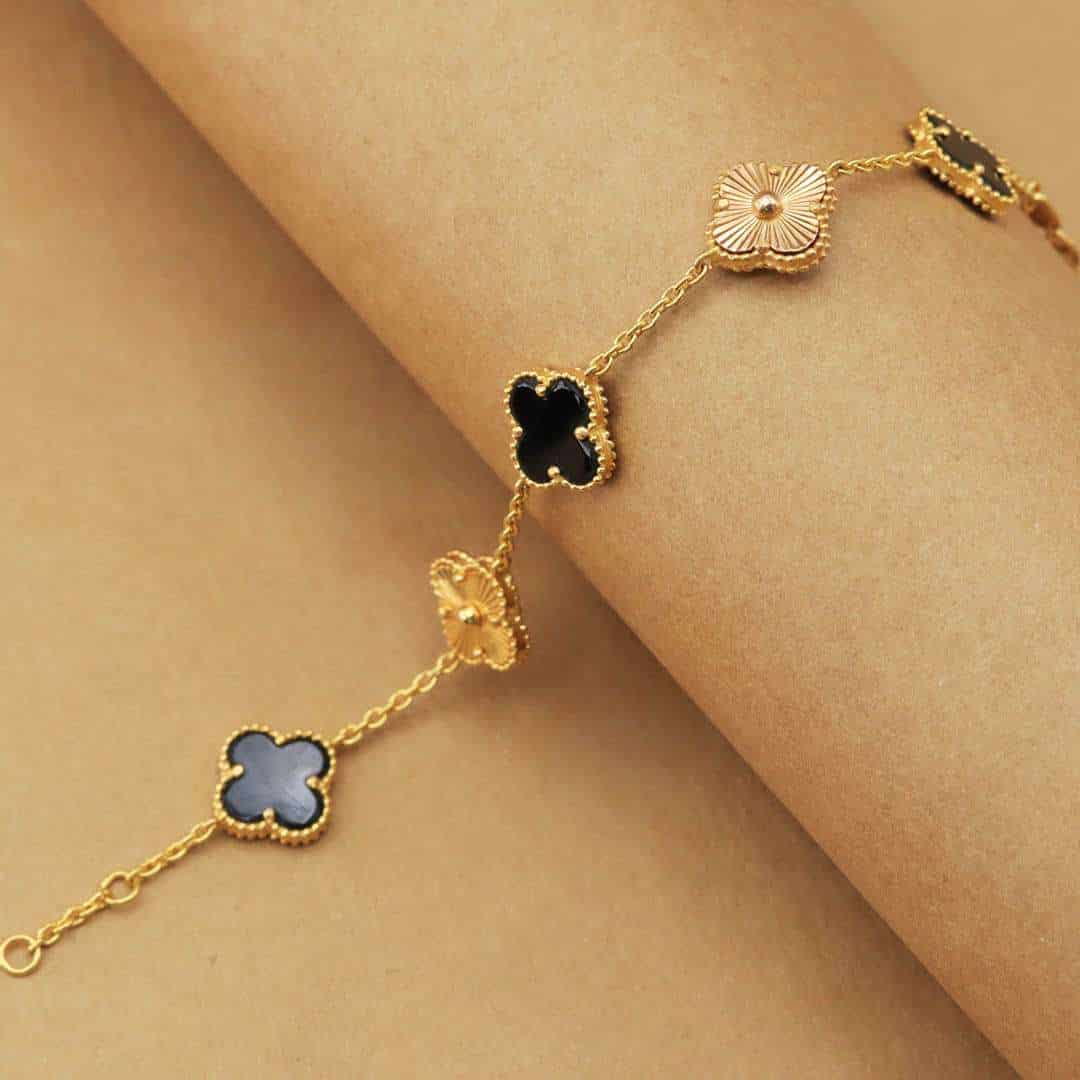Crafted with precision, the bracelet features smooth onyx stones that give it a deep, striking colour. Set against a warm gold band, the contrast adds a sense of luxury without being too flashy. Itโs the kind of bracelet that catches attention, yet still feels grounded and wearable.